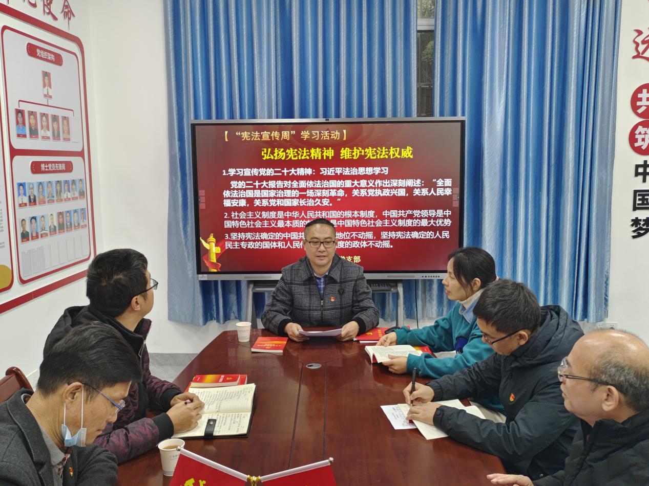 为深入学习宣传党的二十大精神,贯彻落实习近平法治思想,推动宪法宣传教育常态化、长效化,弘扬宪法精神,维护宪法权威,12月1日,在国家宪法日来临之际,科技部党支部开展“学习宣传贯彻党的二十大精神,自觉维护宪法权威”宣传学习活动。会议邀请马克思主义学院刘明山博士领学,科技部党支部全体党员参加学习。会议由党支部书记胡晓熙主持。